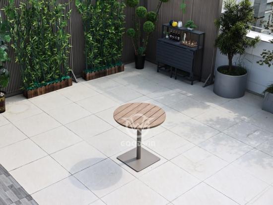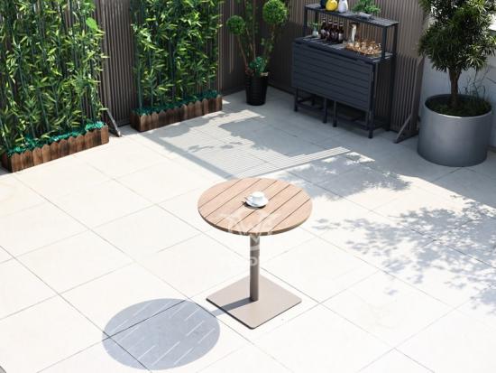 طاولة طعام مستديرة بإطار من الألومنيوم وسطح بلاستيكي خشبي